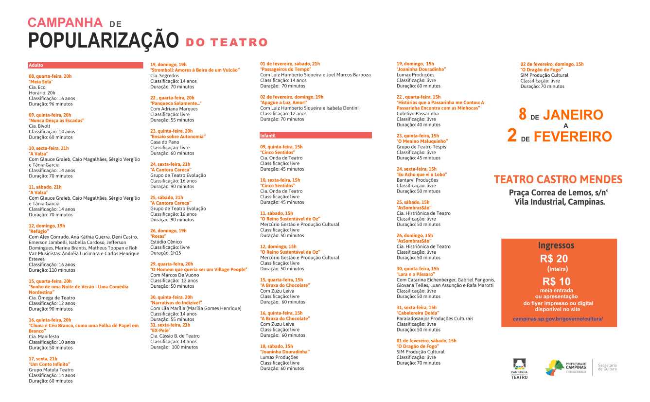 Entre os dias 8 de janeiro e 2 de fevereiro, a Secretaria de Cultura de Campinas promove a Campanha de Popularização do Teatro no Teatro Castro Mendes. que contará com 35 sessões, sendo 16 produções adultas e 11 infantis.