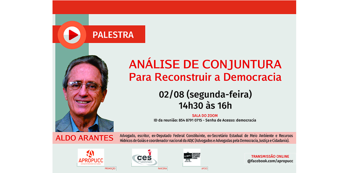 “Análise de Conjuntura: para Reconstruir a Democracia” é o tema da palestra virtual que será ministrada pelo advogado e escritor, Aldo Arantes, na segunda-feira (02/08), das 14h30 às 16h, pelo Zoom.