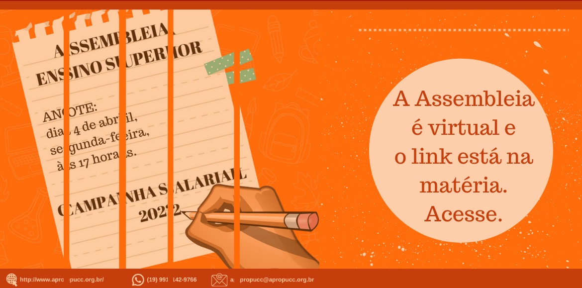 Nesta segunda-feira (04/04), às 17 horas, o Sindicato dos Professores de Campinas – Sinpro realiza a Assembleia virtual da Campanha Salarial para professores do Ensino Superior 2022, com acesso no link – https://us02web.zoom.us/j/88509685160.