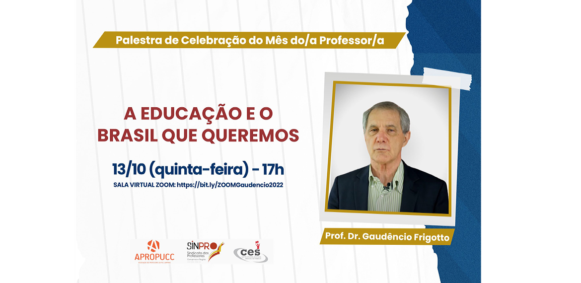 “A Educação e o Brasil que queremos” é o tema da Palestra Virtual que acontece quinta-feira (13/10), às 17h, com o Prof. Dr. Gaudêncio Frigotto, pelo Zoom [https://bit.ly/ZOOMGaudencio2022].
