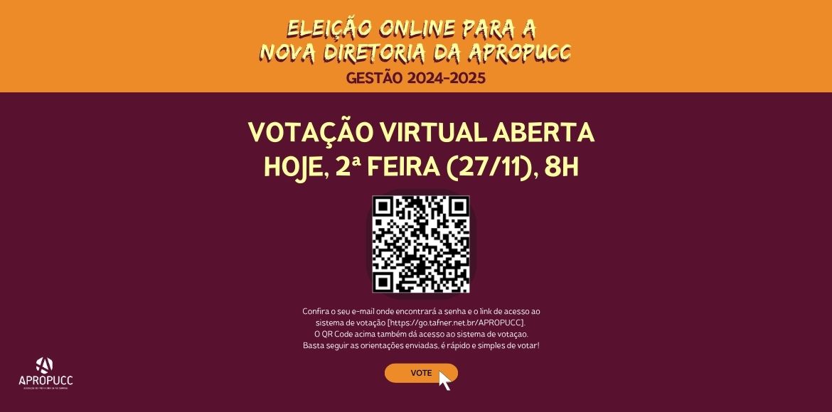 O edital completo da eleição está disponível no link https://bit.ly/EditalApropuccEleicao2023.