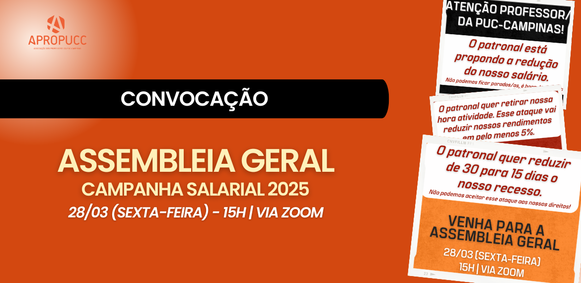 O Sinpro Campinas e Região e a Apropucc convocam os/as professores/as da PUC-Campinas para participarem da Assembleia Geral que acontece nesta sexta-feira (28), às 15h, via Zoom.