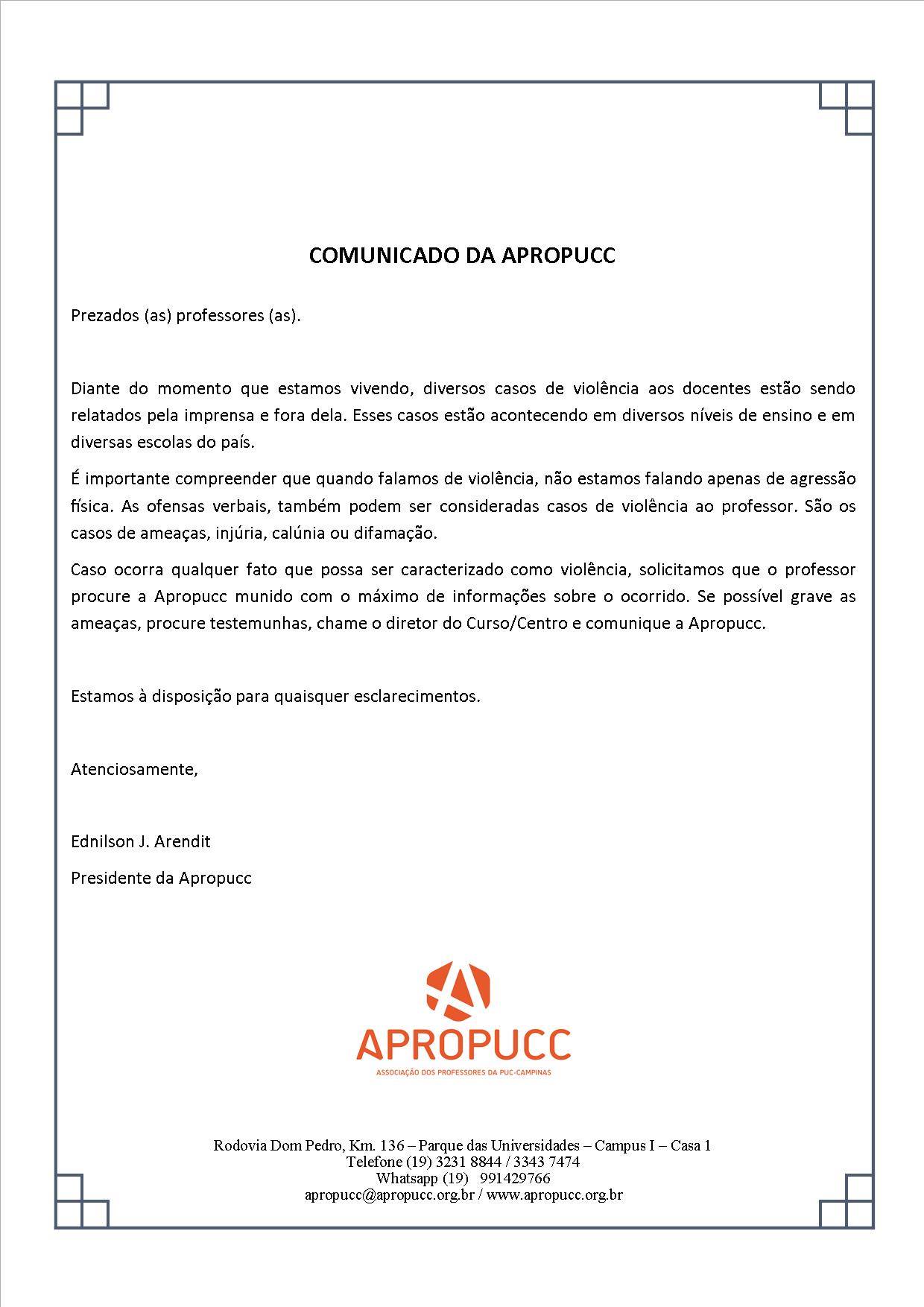 Neste momento conturbado do país em que as perseguições aos docentes promovidas pelo avanço do projeto “Escola Sem Partido” vem crescendo, a Apropucc se coloca a disposição dos professores e das professoras da PUC-Campinas com finalidade de acolher, dar assistência, orientar e encaminhar qualquer tipo de violência ou ataque à liberdade de expressão.