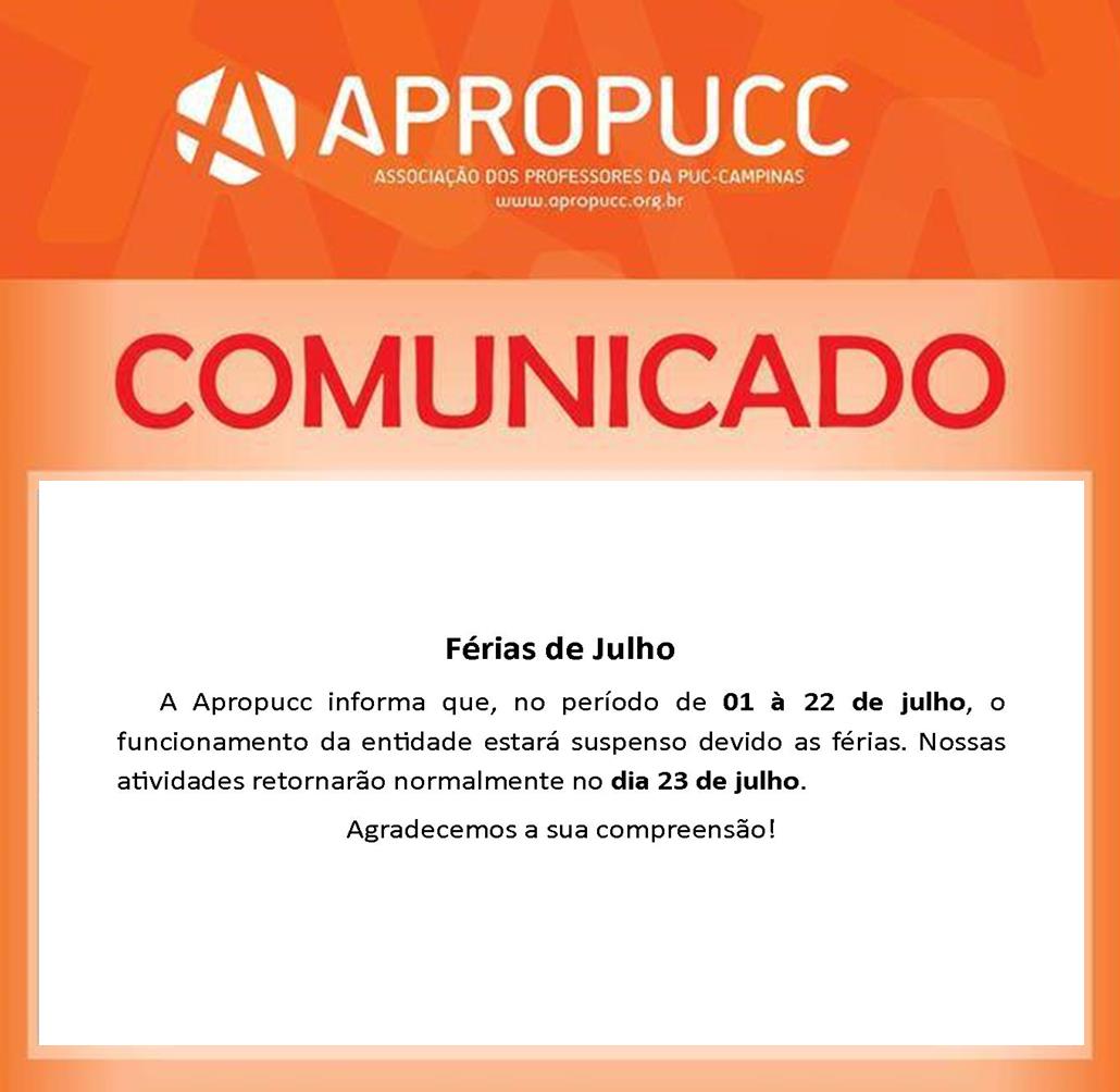 A Apropucc informa que, no período de 1 a 22 de julho estará fechada devido as férias. O atendimento será retomado no dia 23 de julho, no horário normal de funcionamento, das 9h às 15h.